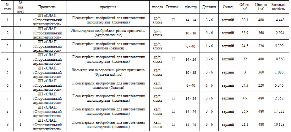 ДП «СЛАП «Сторожинецький держспецлісгосп» виставляє на електронні, публічні (аукціонні) торги «03» жовтня 2013р наступну продукцію:Електронні, публічні (аукціонні) торги проводяться з 14:30 до 15:00