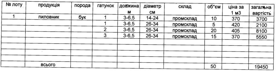 ДП "Путильське ЛГ" виставляє на електронні, публічні (аукціонні) торги «09» жовтня 2013р наступну продукцію:Електронні, публічні (аукціонні) торги проводяться з 14:30 до 15:00 | № | № | | Продукція | Порода | Гатунок | Геометричні розміри продукції | Склад | об’єм лоту (куб.м) | Вартість,грн. | | лота | в лоті | Початкова за куб.м | Початкова за лот | | | | Діаметр(см) | Довжиа(м) | | 1 | 1 | ДП «Путильське ЛГ» | пиловник | ялина | 1 | 14-18 | 3-6 | верхній | 1 | 424 | 424 | | 2 | Черемошське л-во | пиловник | ялина | 1 | 20-24 | 3-6 | верхній | 3 | 479 | 1437 | | 3 | | пиловник | ялина | 1 | 26-34 | 3-6 | верхній | 1 | 495 | 495 | | 4 | | пиловник | ялина | 1 | 36-> | 3-6 | верхній | 9 | 505 | 4545 | | Разом | | | | | | | | 14 | | 6901 | | 2 | 1 | ДП «Путильське ЛГ» | пиловник | ялина | 2 | 14-18 | 3-6 | верхній | 1 | 422 | 422 | | 2 | Черемошське л-во | пиловник | ялина | 2 | 20-24 | 3-6 | верхній | 2 | 449 | 898 | | 3 | | пиловник | ялина | 2 | 26-34 | 3-6 | верхній | 16 | 464 | 7424 | | 4 | | пиловник | ялина | 2 | 36-> | 3-6 | верхній | 12 | 473 | 5676 | | 5 | | пиловник | ялина | 3 | 14-18 | 3-6 | верхній | 2 | 393 | 786 | | 6 | | пиловник | ялина | 3 | 20-24 | 3-6 | верхній | 3 | 416 | 1248 | | 7 | | пиловник | ялина | 3 | 26-34 | 3-6 | верхній | 24 | 432 | 10368 | | 8 | | пиловник | ялина | 3 | 36-> | 3-6 | верхній | 26 | 435 | 11310 | | Разом | | | | | | | | 86 | | 38132 | | | Всьго | | | | | | | | 100 | | 45033 |