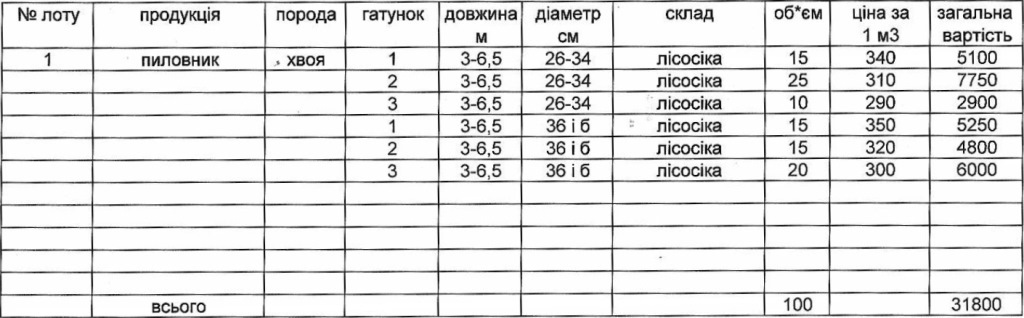 ДП "Сторожинецьке ЛГ" виставляє на електронні, публічні (аукціонні) торги «24» грудня 2013р наступну продукцію:Електронні, публічні (аукціонні) торги проводяться з 14:30 до 15:00 | № лоту | № під-лоту | Продавець | Продукція | порода | Гату- | діаметр | Довжина | склад | Об’єм, | Ціна за 1 м3 | Загальна вартість | | нок | м3 | | 2 | 1 | ДП "Сторожинецький лісгосп" | Лісоматеріали необроблені (баланси) | хвоя | | 6-24 | 1,0-2,0 | Верхній | 143,00 | 215,00 | 30745,00 | | | | | | | | | | | 143,00 | | 30745,00 |